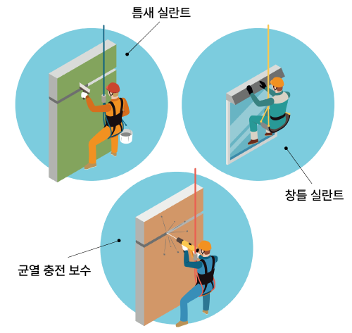 구축 건물의 경우 외부 코팅이 벗겨져 콘크리트가 드러날 수 있는데 적절한 시기에 코팅을 하지 않으면 외벽의 균열로 빗물이 흘러 들어갑니다. 이런 경우, 균열이 발생한 곳을 일부 깎아 내고 특수 실란트로 보수한 후 외벽을 페인트로 마감하는 과정을 거칩니다.